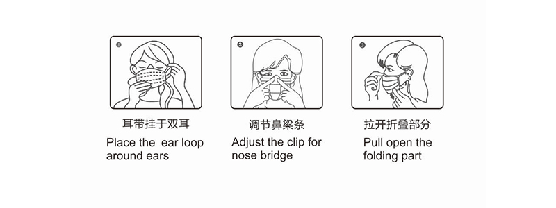 1.Take out the mask and sit upward the nose bridge clip make sure the mask completely cover the nose, mouth and chin